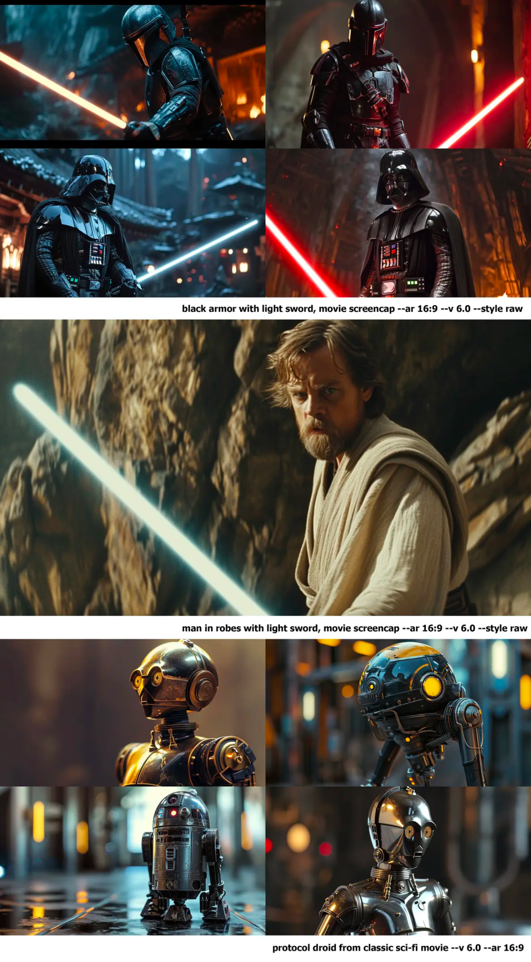 在视觉生成领域中,这个问题的答案也是肯定的。在下面展示的例子中,他们没有在提示词中涉及《星球大战》或者角色,但是 Midjourney 却生成了达斯・维德、卢克・天行者、R2-D2 等家喻户晓的经典形象。