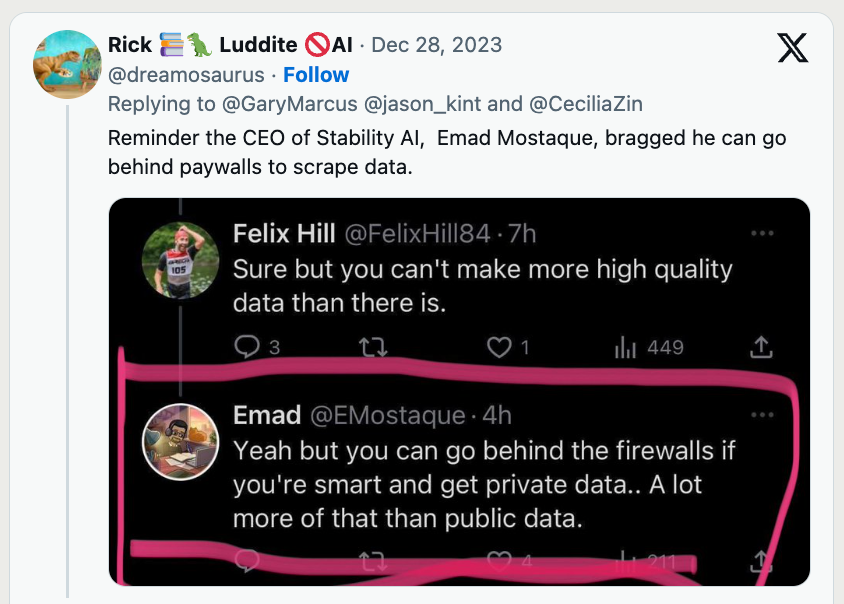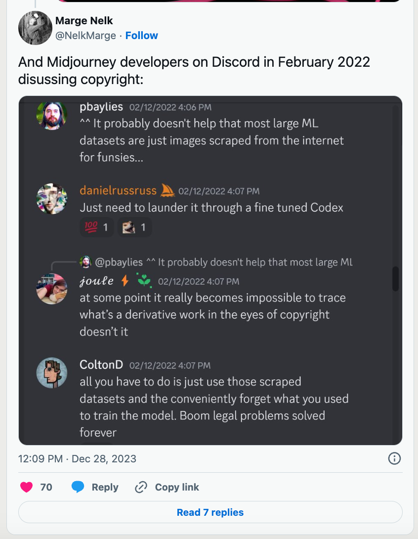 更糟糕的是,Marcus 发现有证据表明 Midjourney 的一名高级软件工程师在 2022 年 2 月参与了一场关于如何通过「通过微调代码」来「洗白」数据以逃避版权法的对话。