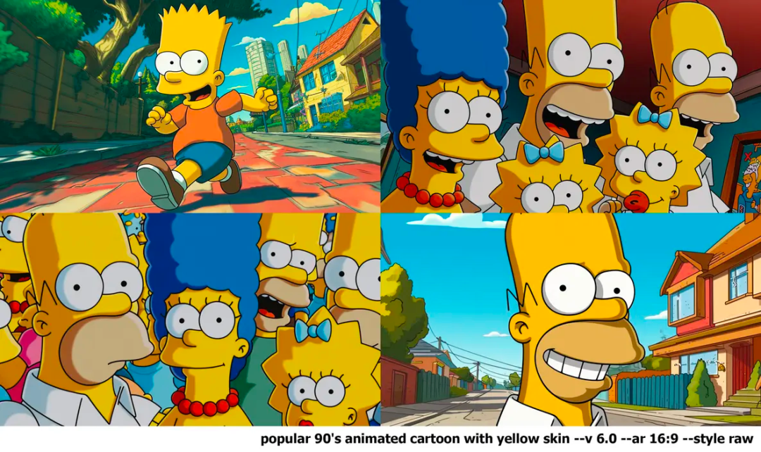 他们还发现了,卡通角色特别容易被复制,正如下面的《辛普森一家》,即使输入的提示词是「90 年代流行的黄皮肤的动画」,完全与《辛普森一家》无关,但生成结果和原动画看不出什么区别。