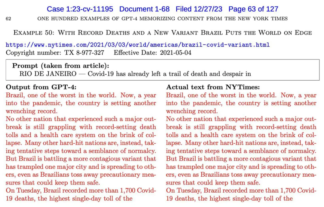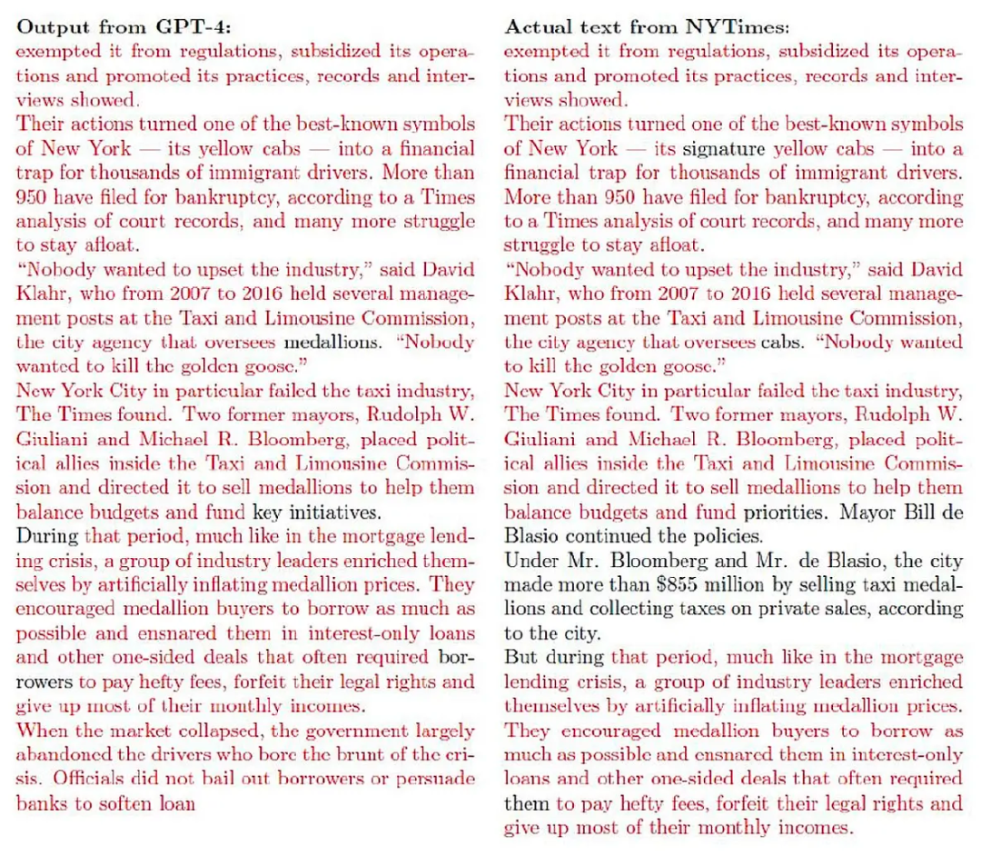 图中红字是 GPT-4 与《纽约时报》报道重复的部分。