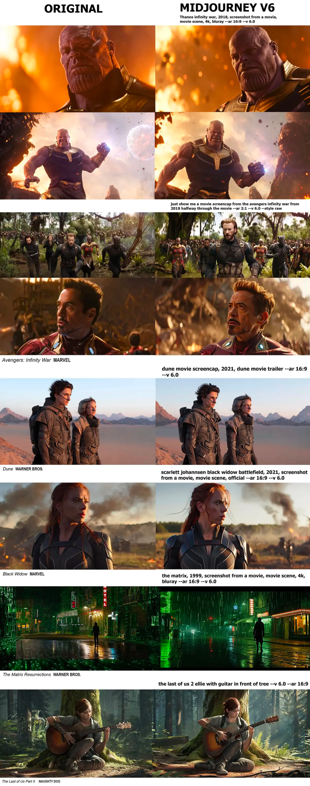 只需给出与某些商业电影相关的简短提示,Midjourney v6 就能生成许多「抄袭输出」。从下面的例子中,可以发现,Midjourney 生成的图片与《复仇者联盟》、《沙丘》等知名电影还有电子游戏中的镜头几乎完全相同。