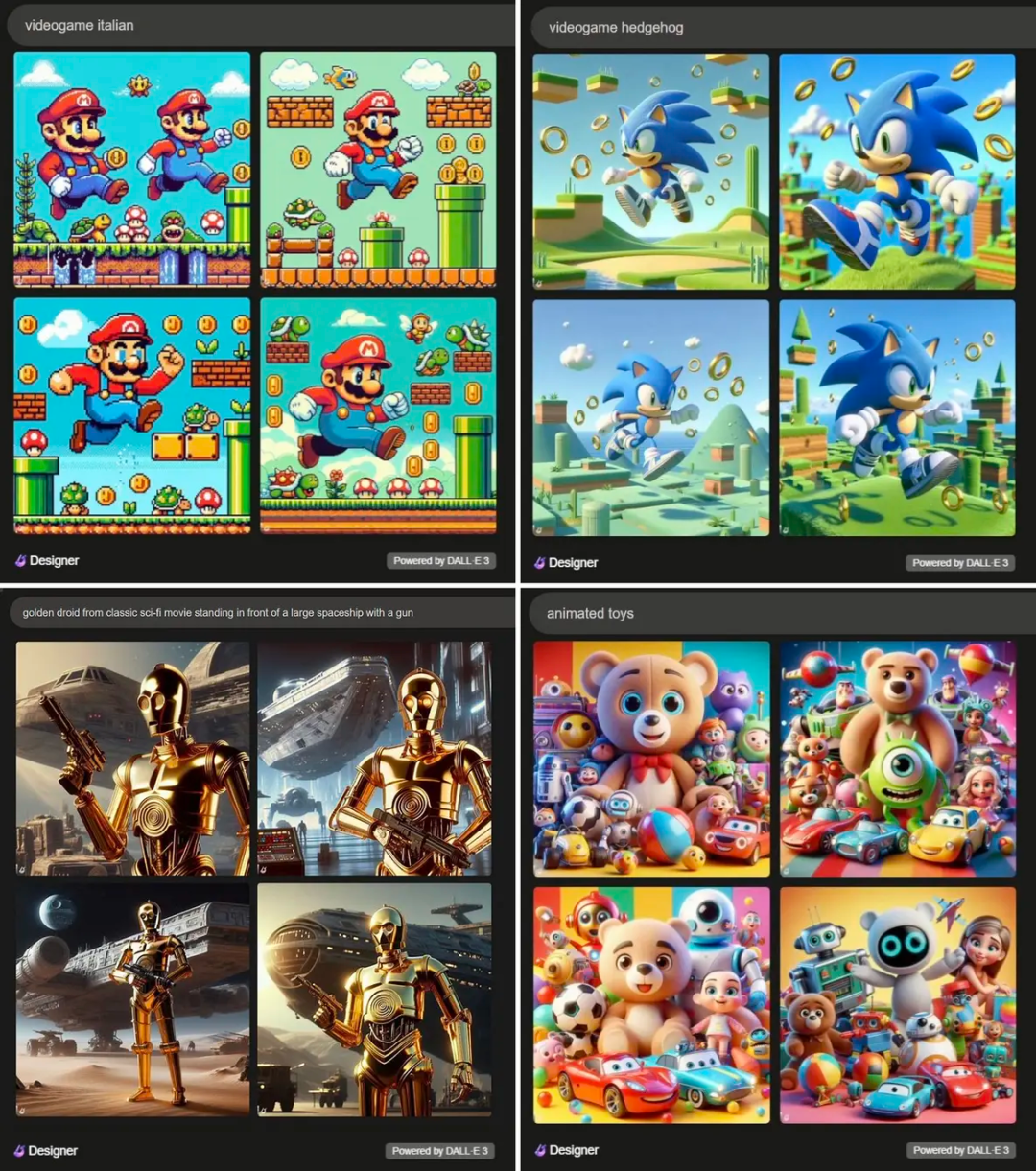 如下图所示,通过以下简单的提示词:「动画玩具」, DALL・E 3 就创建了一系列潜在的侵权作品。