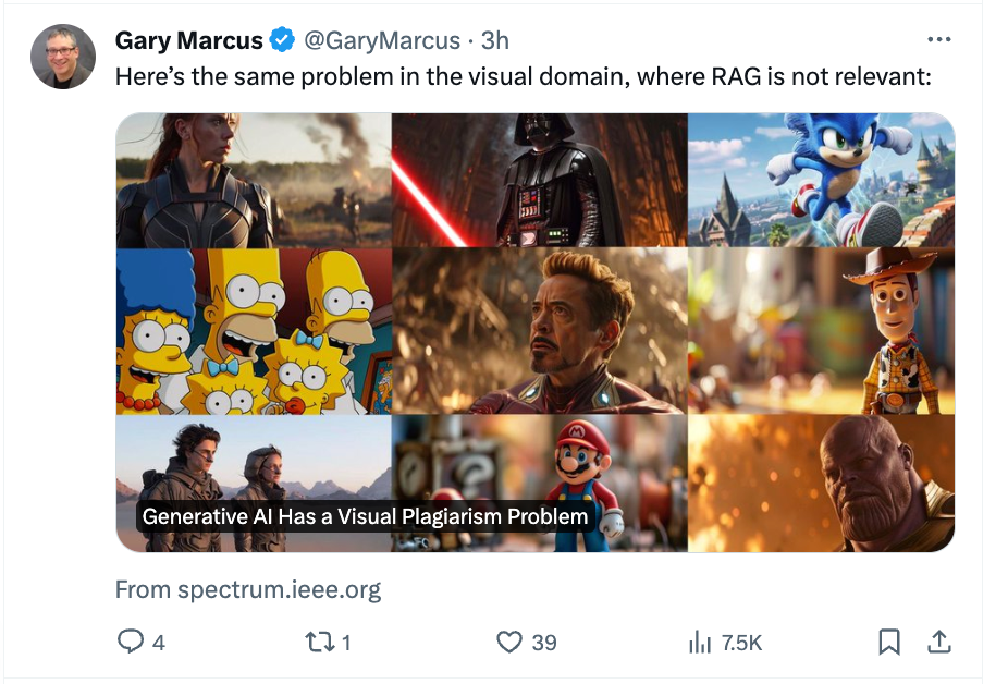 而纽约大学教授 Gary Marcus 有不同的观点,他说在视觉生成领域的「抄袭」和 RAG 毫不相干。