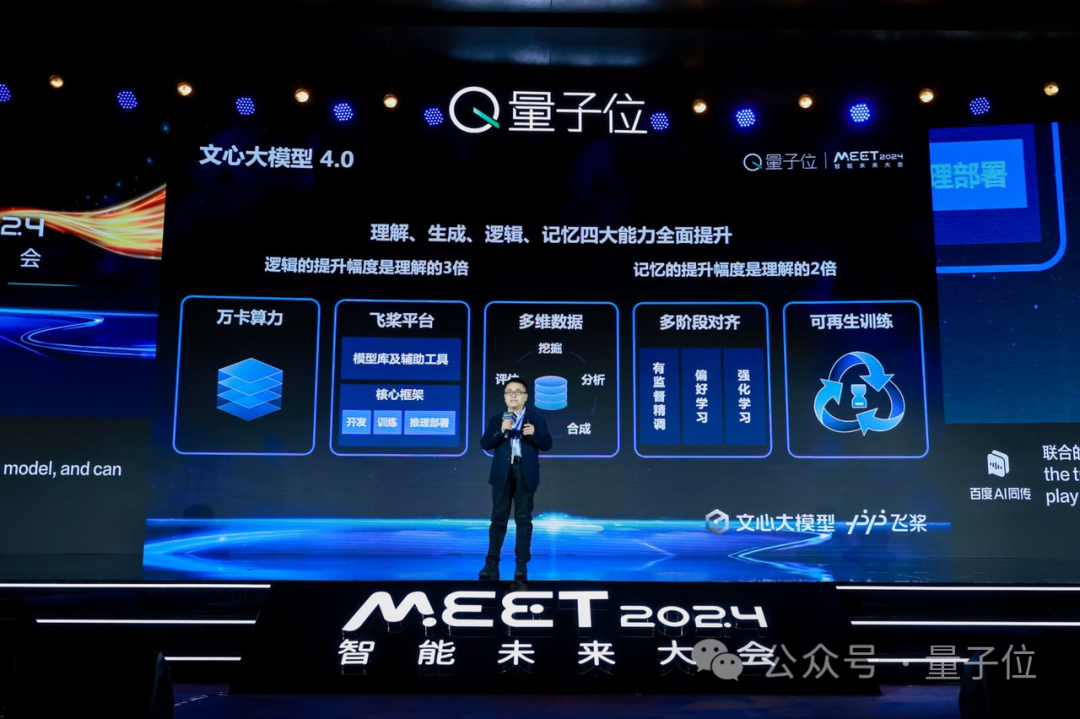 在MEET2024智能未来大会现场,百度AI技术生态总经理马艳军以文心一言为例,全面介绍了知识增强大语言模型,还介绍了围绕大模型建设的生态以及未来发展趋势。
