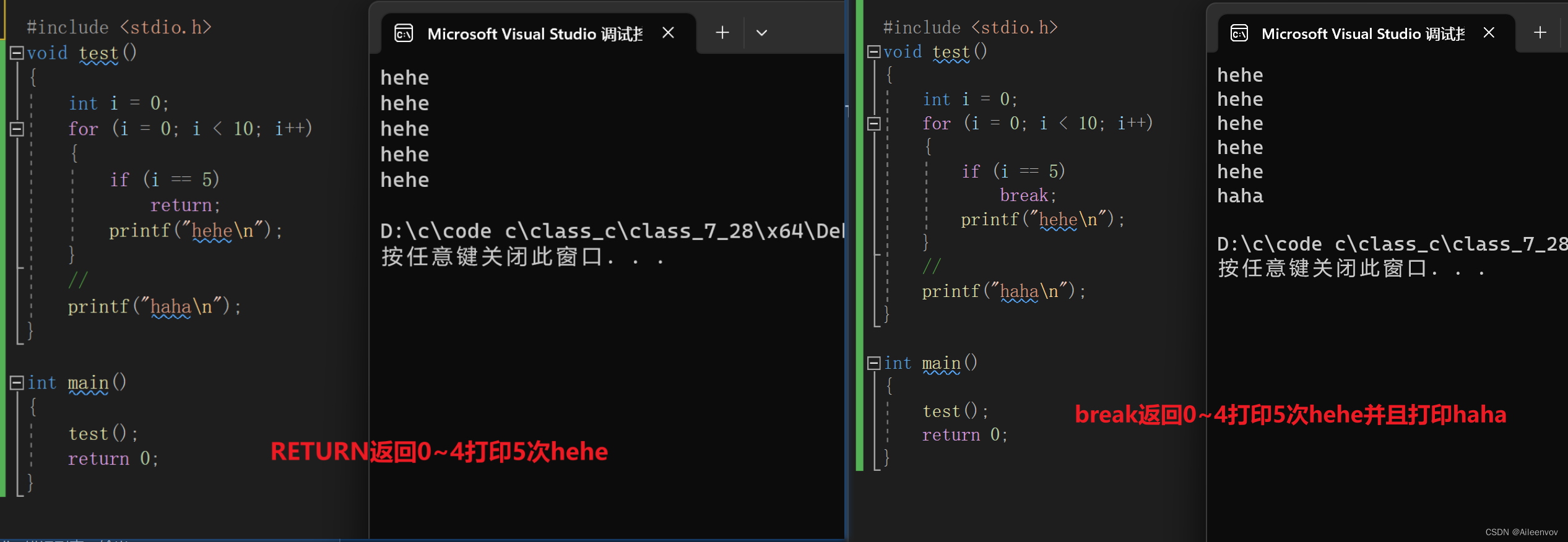 注意:这里的return和break不同,break只能用于跳出循环,但是后面的操作还能继续,而return语句执⾏后,函数就彻底返回,后边的代码不再执⾏。 .代码如下: