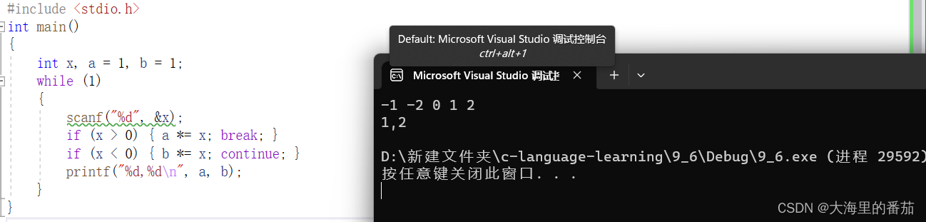 当x=1时,走代码2,令b*=1,所以b=-1。当x=-2时,走代码2,令b*=x,所以b=2。当x=0时,直接打印出a,b,此时a=1,b=2,所以打印出1,2。而当x=1时会走到代码1跳出循环,后面的2依然存放在数据流中,不会赋值给x,当程序结束之后会被清除,对于此题并无影响。至此,程序结束,最终输出1,2,答案选B