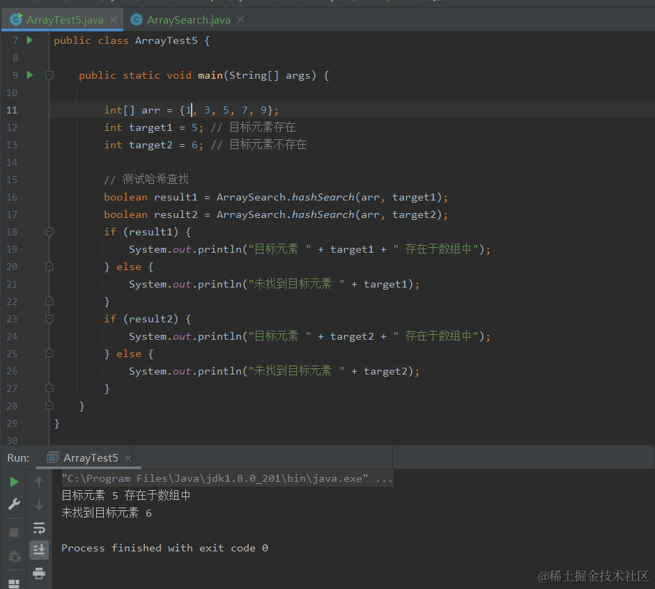 该代码主要是测试数组中的哈希查找方法。首先定义了一个整型数组arr,然后分别定义了两个目标元素target1和target2,并通过调用ArraySearch类中的hashSearch方法查找这两个目标元素是否存在于arr数组中。最后根据查找结果输出对应的提示信息。