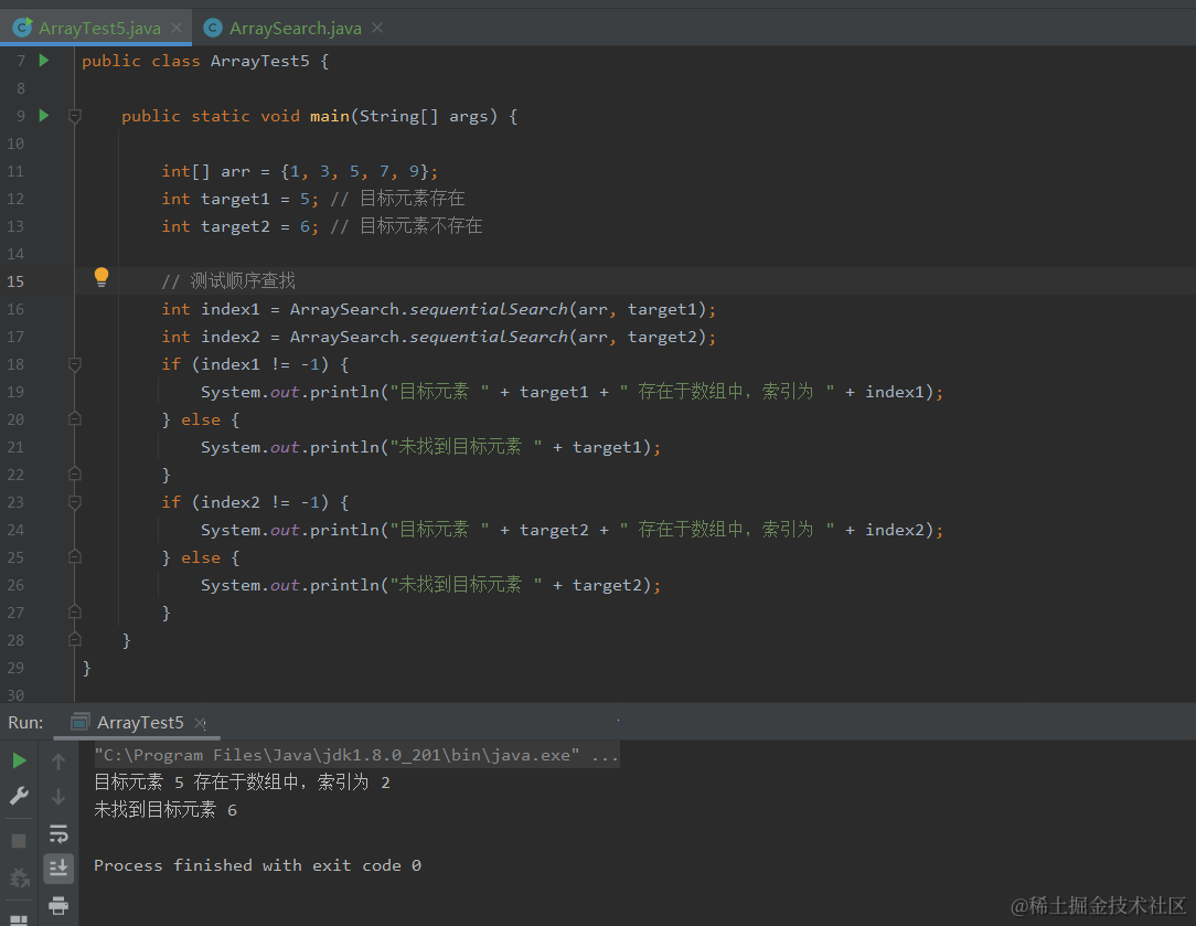 System.out.println("目标元素 " + target1 + " 存在于数组中,索引为 " + index1);
