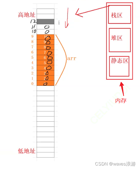 i和arr是局部变量,是放在内存中栈区上的,栈区内存的使用习惯:先使用高地址处的空间,再使用低地址处的空间;又因为数组随着下标的增长,地址是由低到高变化的。