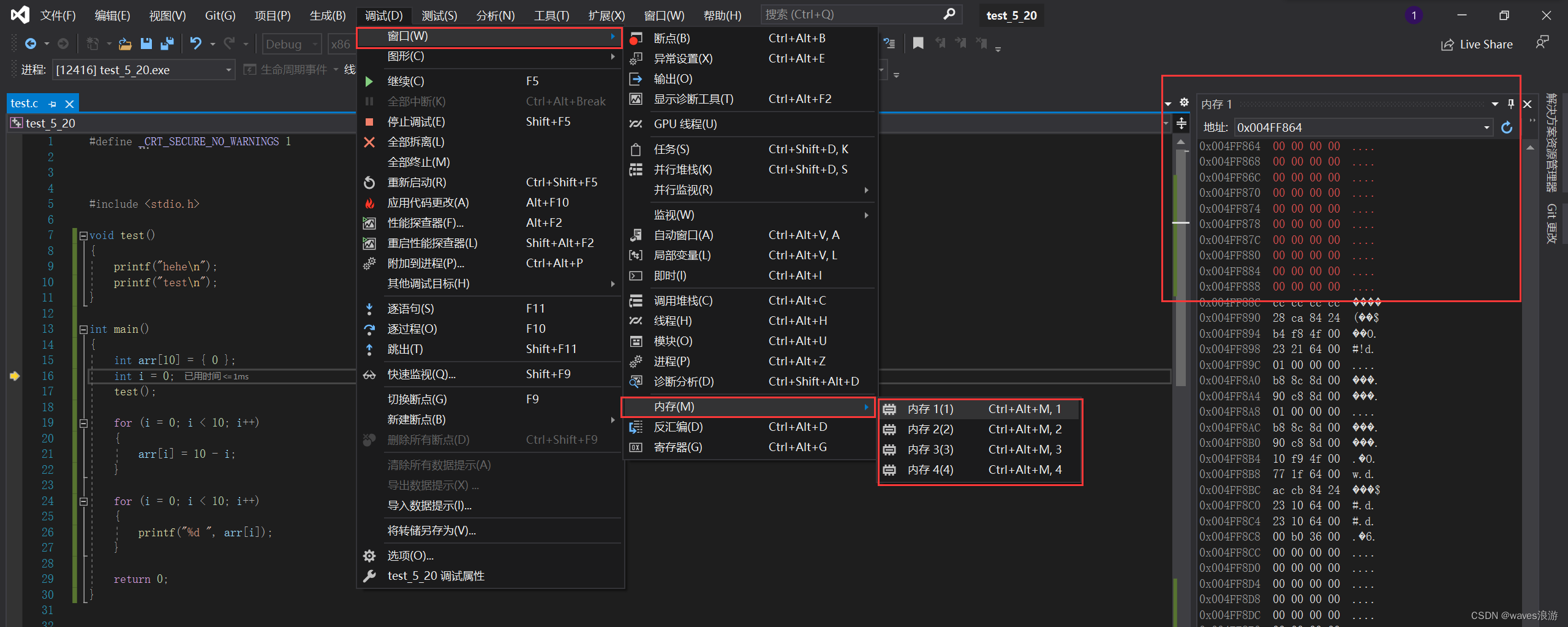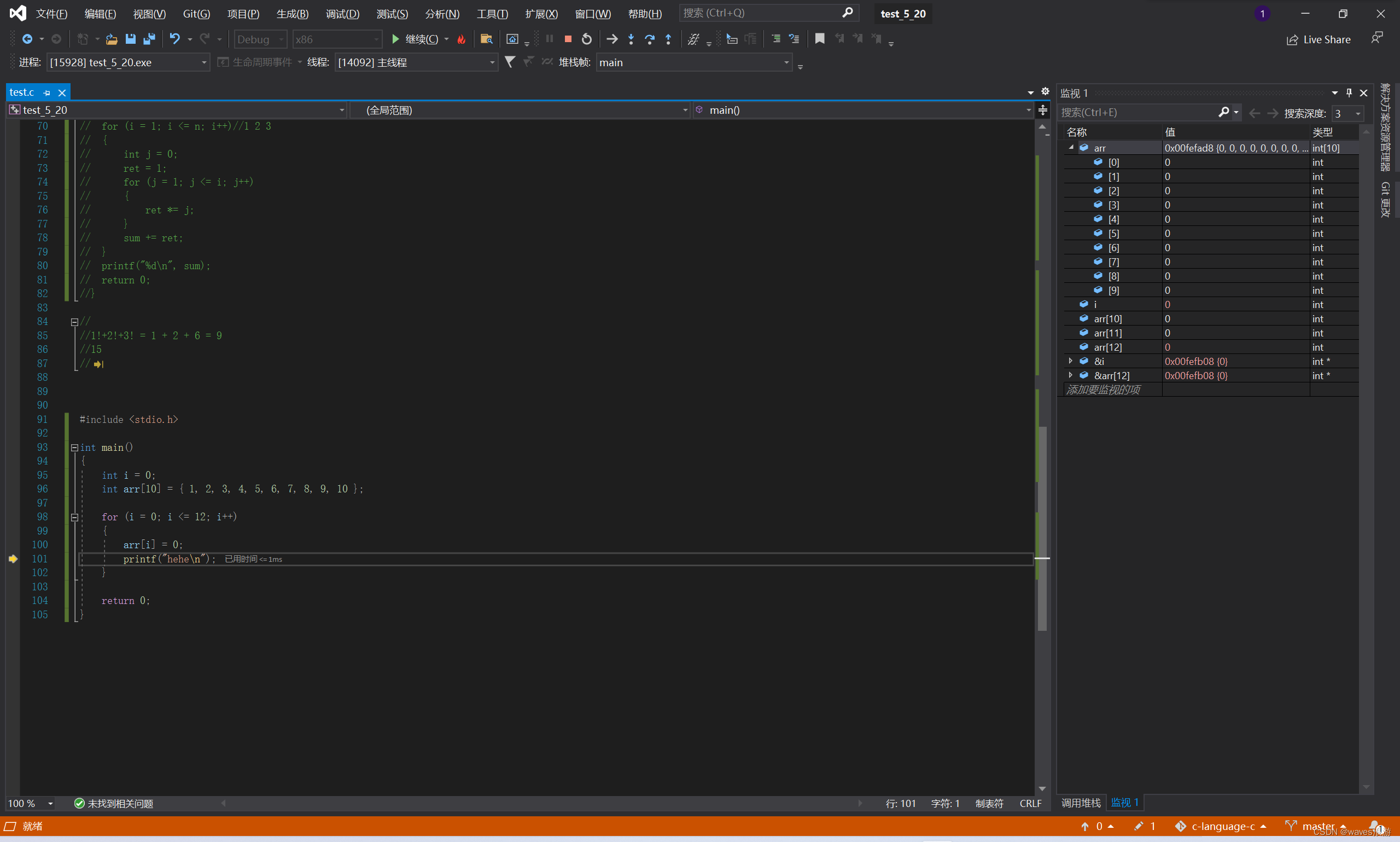 通过调试,我们发现当i = 12,arr[i] = 0时,arr[12]和i同时变为0,于是我们可以取出arr[12]和i的地址进行观察,发现它们的地址是相同的,因此,当把arr[12]改为0的同时,也把i改成了0,所以造成了死循环。