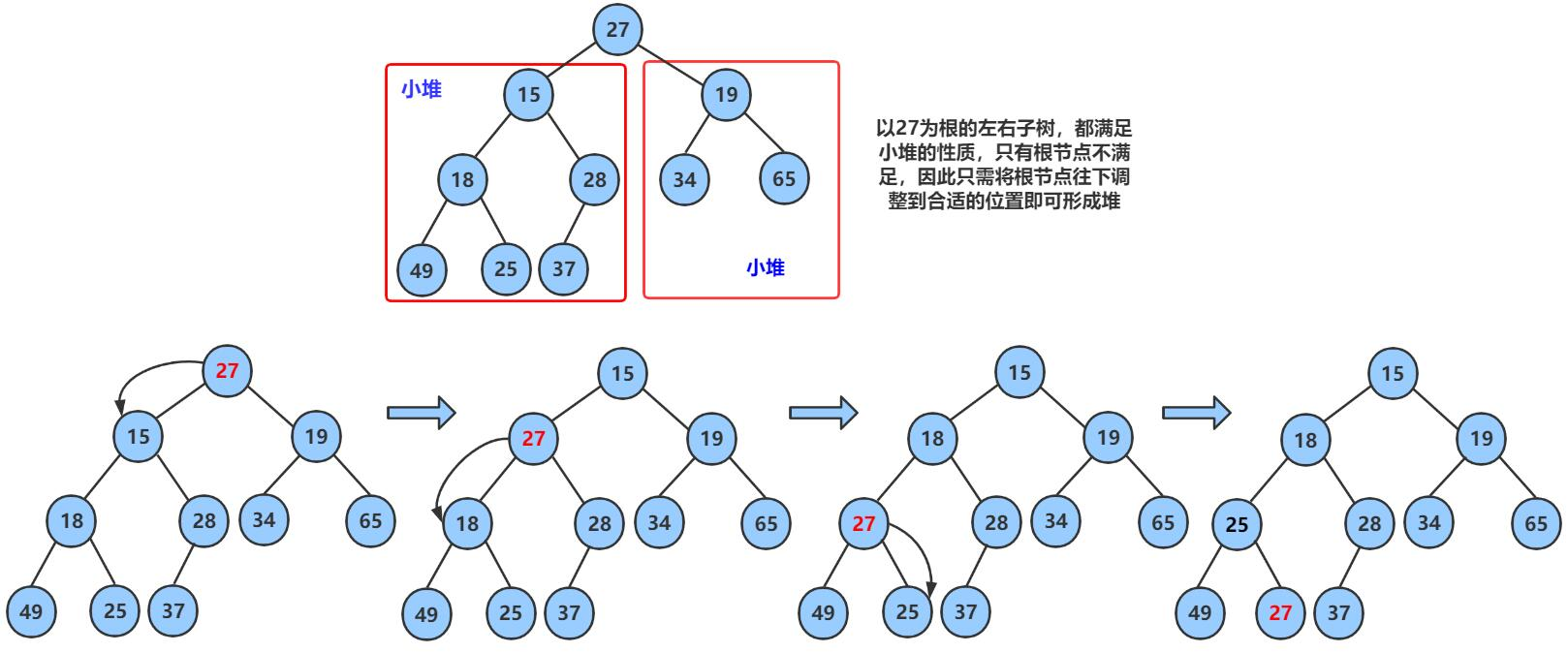一个数组,逻辑上看做一颗完全二叉树。我们通过从根节点开始的向下调整算法可以把它调整 成一个小堆。向下调整算法有一个前提:左右子树必须是一个堆,才能调整。