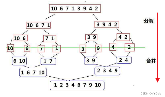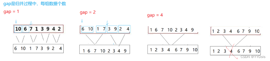 }归并原理:两个有序数组进行比较,并尾插到新空间。 PS:结合递归后,即可细分到只剩两个数归并形成有序数组,两两合成新的有序序列,并拷贝到一块新空间(避免覆盖原数组),新空间的位置关系要与原数组对应