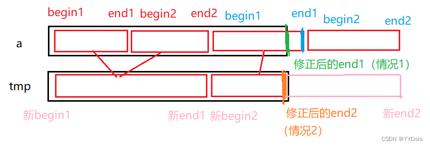 分析:本质上是不断选取【begin1,end1】【begin2,end2】 注意点:以下分析是在归并进行前,对下标对应空间进行讨论! 1.当begin1和end2和并后形成新begin1,end1时,若end1临界(begin2越界)/end1越界,则停止归并 2.当end1越界时,则对end1进行修正