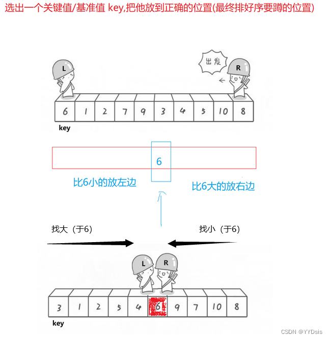 }1.交换法 1.左边做key,右边先走——保证相遇位置比key小 ps:【右边先走找比key小的数,则其停止位置一定小于等于key】 2.由于左右相遇的位置一定比key小,把左边与相遇位置替换