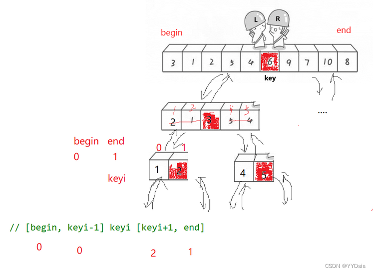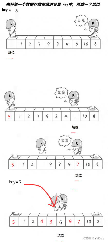 2.挖坑法 1.先将左边第一个数据放在临时变量key中,原地形成一个坑位 2.右边先动,找小于key的数,放到坑位中,并且原地新生成一个坑位 3.当左右相遇时,将key填入最后一个坑位中
