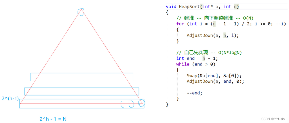 2.直接插入排序,是取每一个数和前面所有数进行比对。无论如何都要先取,所以最好情况即有序情况即是n,最坏情况相当于一个数组的遍历,n^2。 3.快速排序当keyi每次都能取中间值时,接近二叉树,nlogn。keyi每次都取最左/右值时,即相当于一个数组的遍历,n^2。 4.归并排序,接近二叉树,nlogn。由于需要tmp新空间容纳归并后的新空间,空间复杂度为n 5.堆排序,分为堆调整(向上向下)和用删除思想堆排序两部分,根据数学计算知道后者复杂度为nlogn,即堆排整体为nlogn。