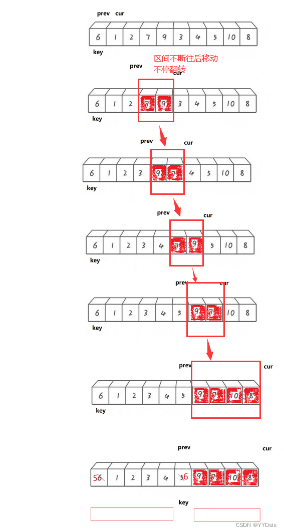 3.前后指针法(玩区间) 1.左边第一个数设为key,prev(延迟指针),cur(实时指针) 2.cur开始向右移动,找到比key小的值prev和cur同时移动 3.找到比key大的值只移动cur——保证prev和cur中间隔着一段比key大的区间 4.找到比key小的值时,交换prev下一个位置(比key大的区间)和cur位置的值——比key大的值翻到区间右边,把比key小的值翻到区间左边。