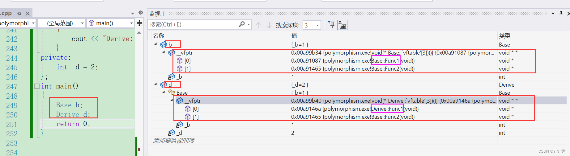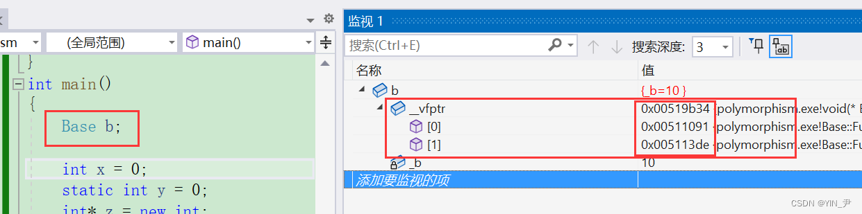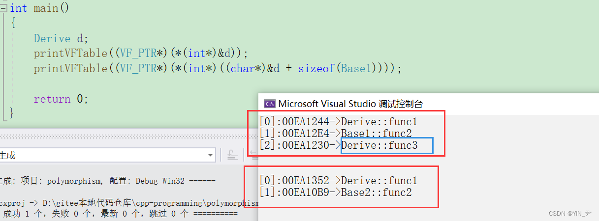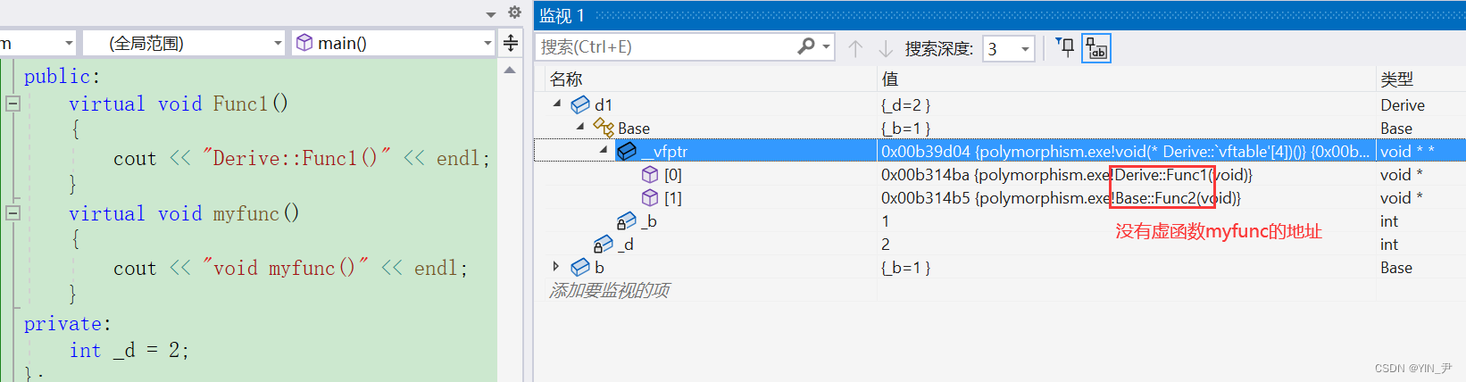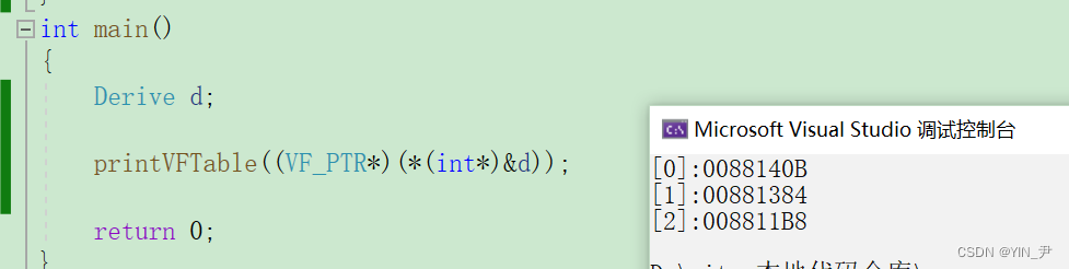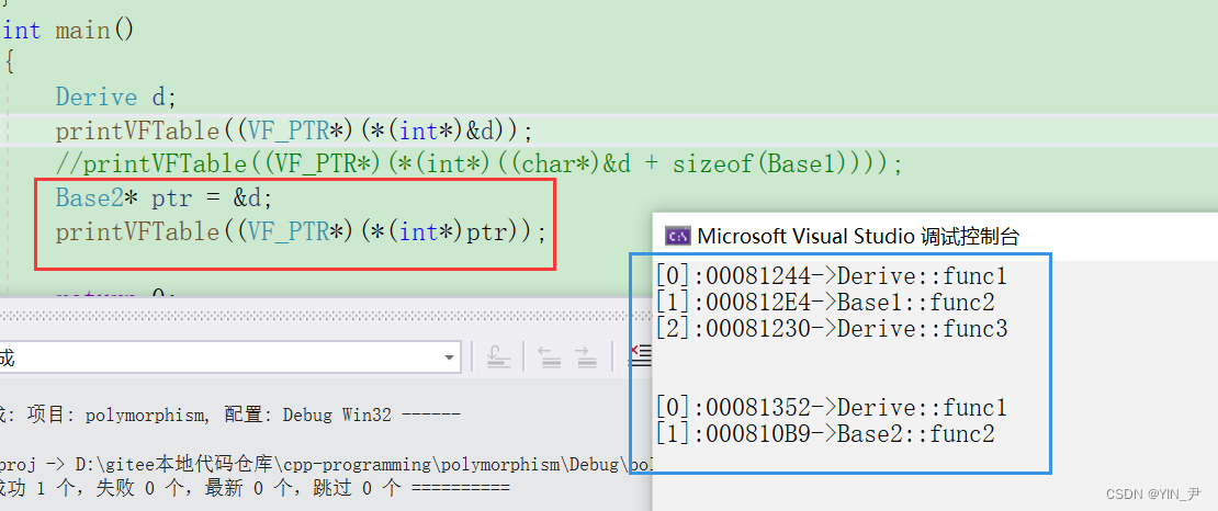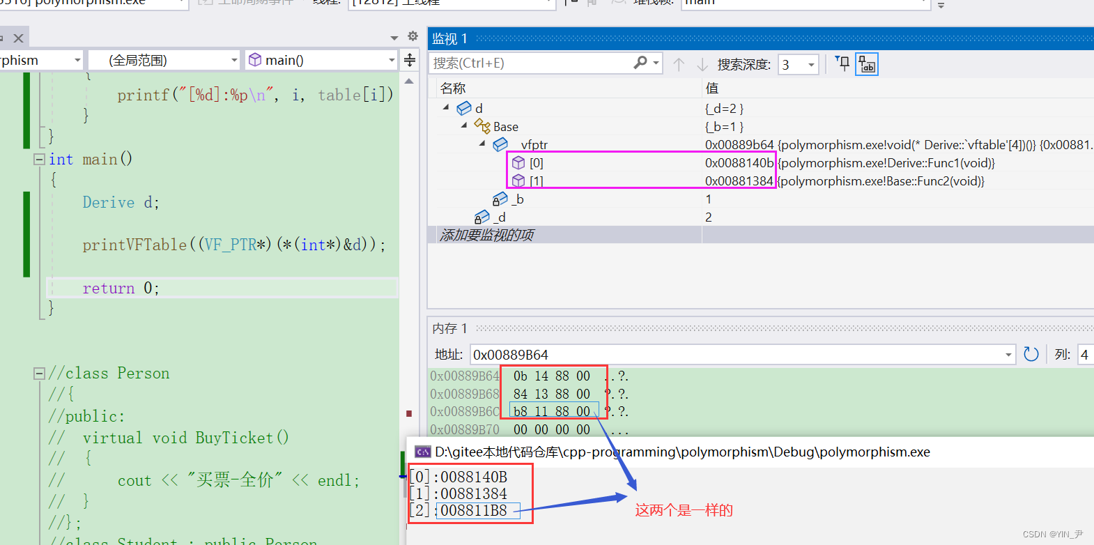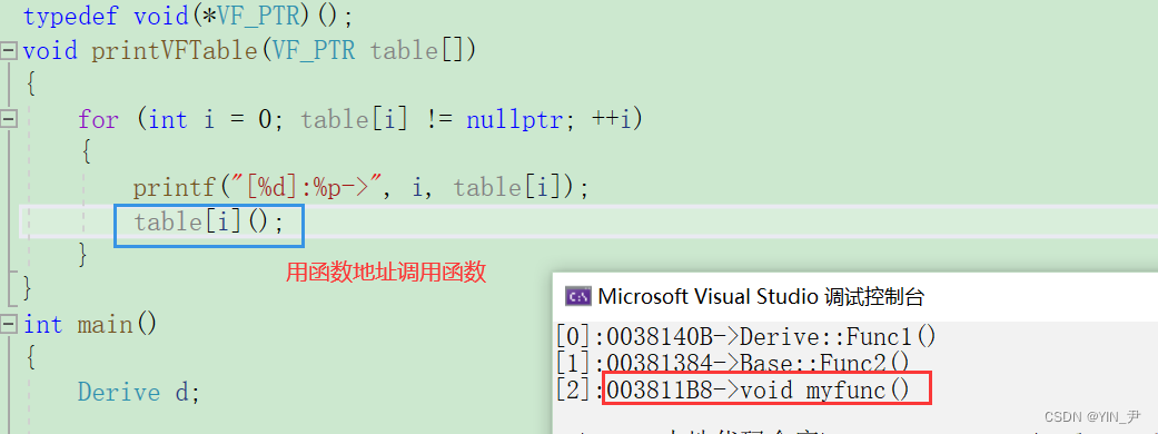 我们看到前两个地址和监视窗口显示的是一样的,第三个地址和前两个很相近,所以我们猜测第三个就是myfunc的地址。 这里如果我们直接打印虚函数地址去验证的话,可能会发现打印出来的跟虚表里的地址不一样,可以理解为虚函数表内的地址是虚函数实际地址的一种间接表示形式,这可能与C++中的多态性、动态绑定和继承机制所导致的。