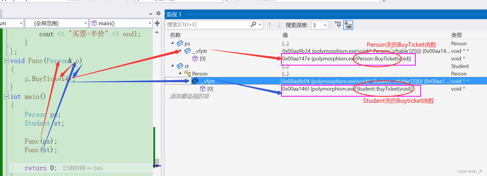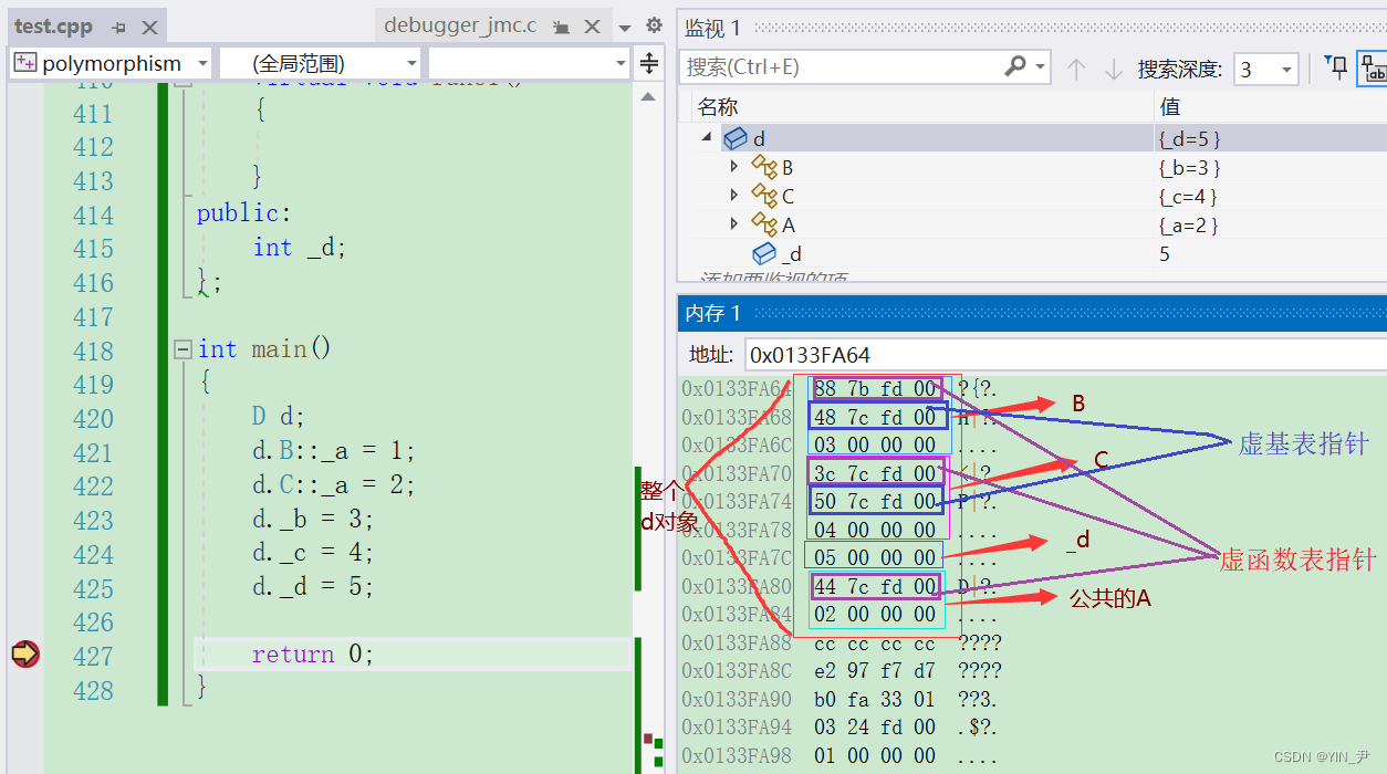另外我也能知道虚函数表其实就是一个虚函数指针数组,存放虚函数的地址,所以虚函数指针_vfptr其实就是一个数组指针(函数指针数组的指针)