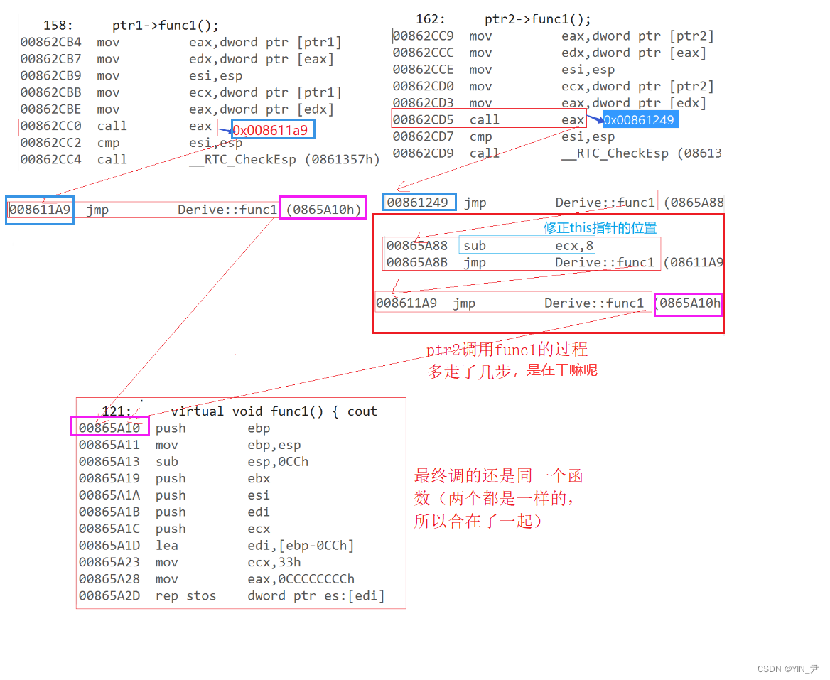 不过汇编我们可能看不太懂。 但是我们知道它这里做的事情其实就是通过对象头4/8个字节里面存的虚函数指针去找到虚函数表,然后调用对应的虚函数。 所以多态时的函数调用就不是在编译期间就能确定要调用的函数了,而是在运行期间通对象里的虚函数指针找到虚表,然后确定要调用的具体函数。