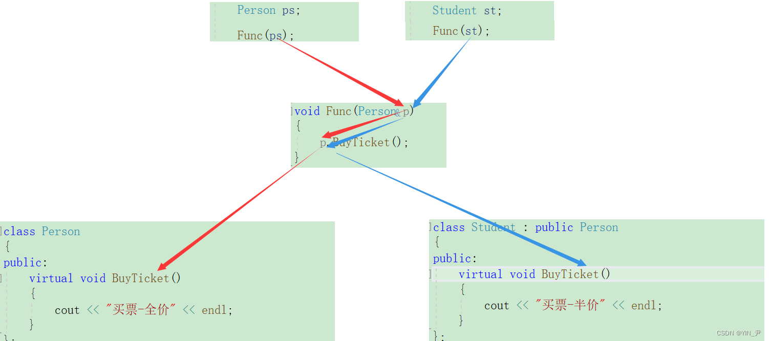 相信大家看这张图就应该明白怎么回事了。 我们说如果实现多态的话,去调用的时候还跟引用或指针的类型有关吗? 是不是无关啊,而是跟它指向的对象的具体类型有关,它指向的对象是什么类型的,就去调该类对应的虚函数,从而就实现了多态——不同的对象调用同一个函数,产生不同的结果。 所以他这里是怎么实现的? 🆗,其实就是通过对象里的虚函数指针,去找到其对应的虚函数表,那子类对象的虚指针就指向子类的虚函数表,父类对象的虚指针就指向父类的虚函数表,那这样它们就能调到不同的虚函数,进而实现多态(不同对象去完成同一行为时,展现出不同的形态)。
