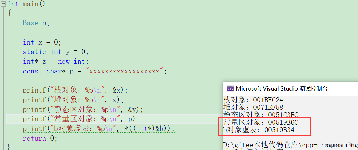 // printf("b对象虚表:%p\n", *((int*)&b));