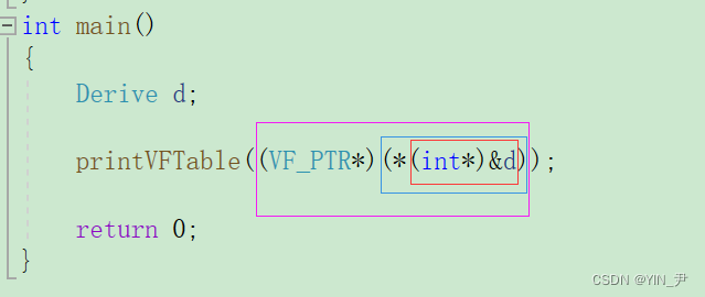 char*,然后解引用,就拿到第一个字节的内容了。 那这里也可以用同样的方法: 这里我们把对象的地址强转成int*,然后解引用,不是就拿到前四个字节的内容了嘛。 但是int*解引用是个int,而形参本质是个函数指针,所以我们可以再强转一个