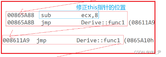 大家看,当前这两个虚基表指针的地址,-4是不是正好得到虚函数表指针的地址啊,因为现在一行4字节。
