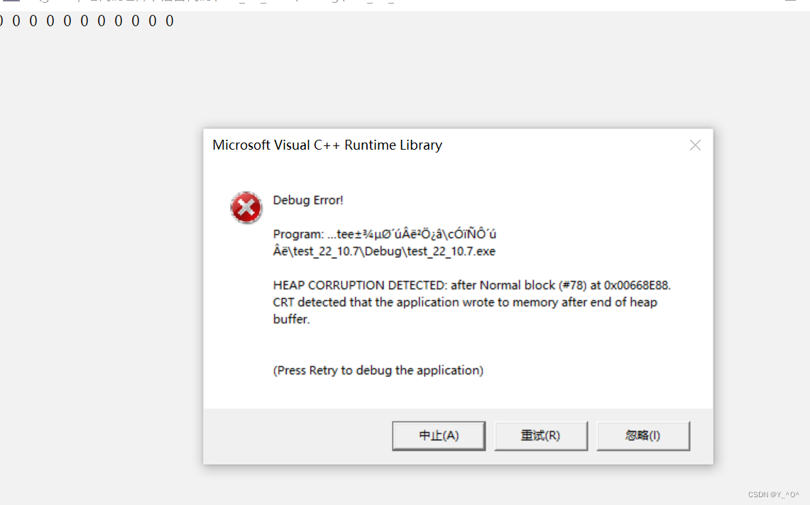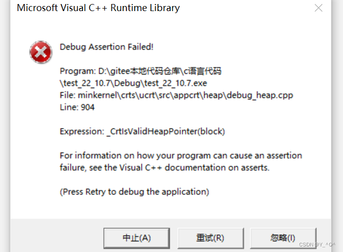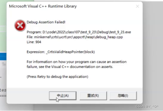 }上面的代码中,我们使用malloc开辟了5个整型大小的空间,即20个字节,那p 作为1个整型指针,加1跳过4个字节,那我们循环10次,是不是就越界访问了啊。 这时我们运行就出错了: