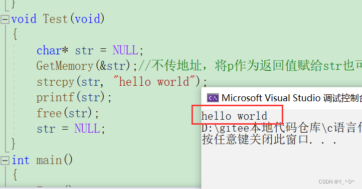 GetMemory(str);调用结束,下一句代码是:strcpy(str, "hello world");看到这里我们应该能猜出来这段代码的目的: 应该是想把字符串"hello world"拷贝到函数GetMemory(str)中动态开辟的那100个字节空间里,然后打印出来。