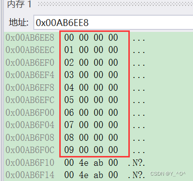 }40个字节,我们可以放10个整型,0到9。 我们也可以通过内存观察一下: