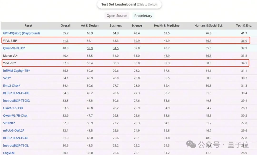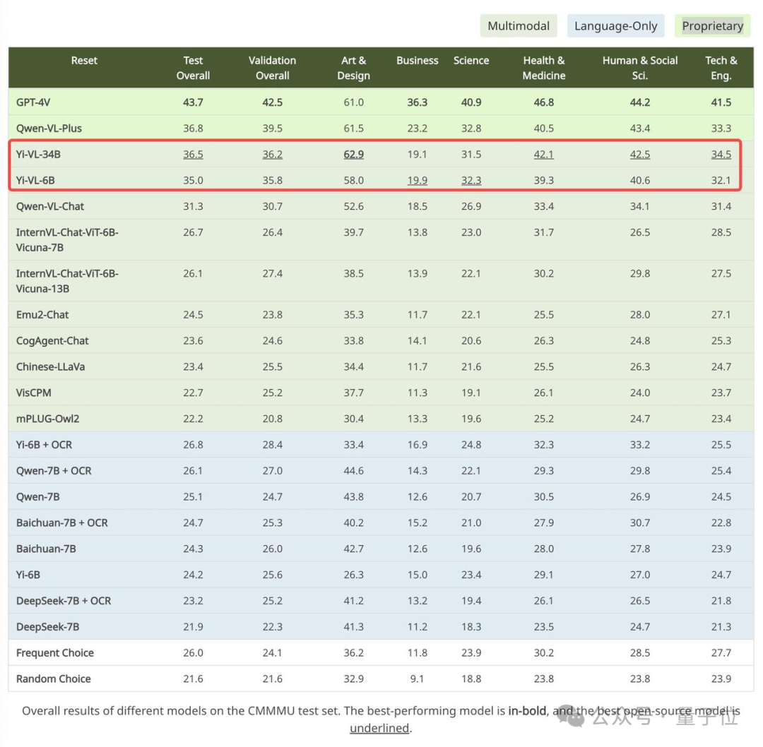 在全新多模态基准测试MMMU中,Yi-VL-34B、Yi-VL-6B两个版本均有不俗表现。