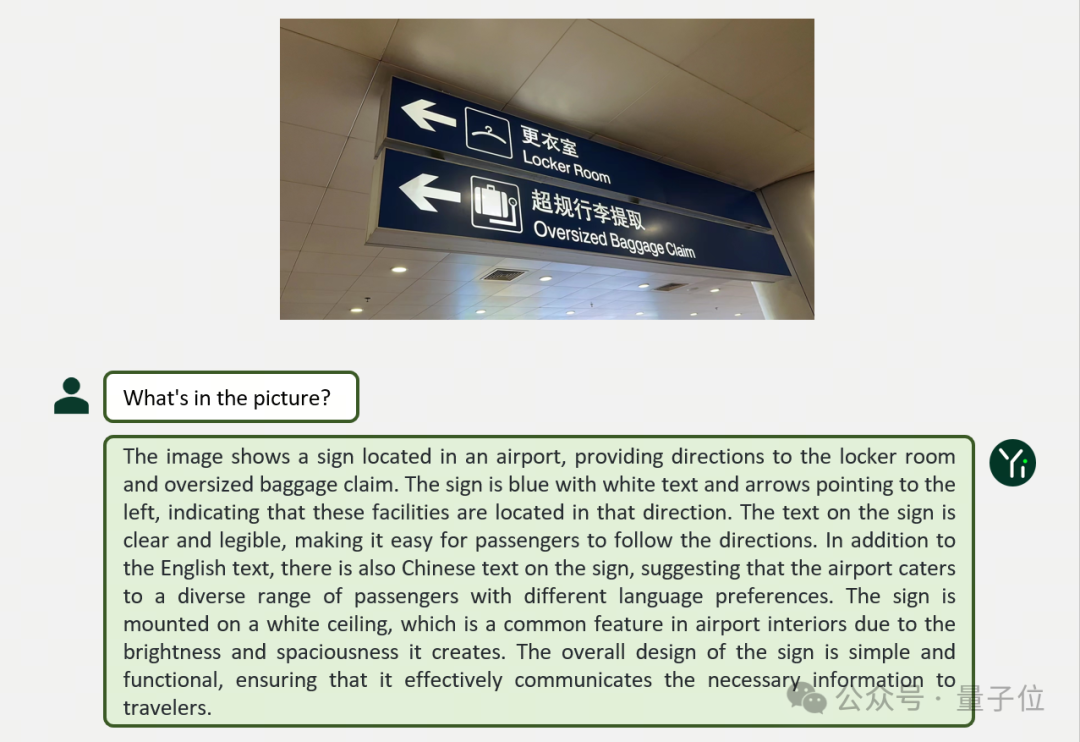 Yi-VL对整幅图做了详细分析,不仅说明了指示牌上的内容,甚至连“天花板”都有照顾到。