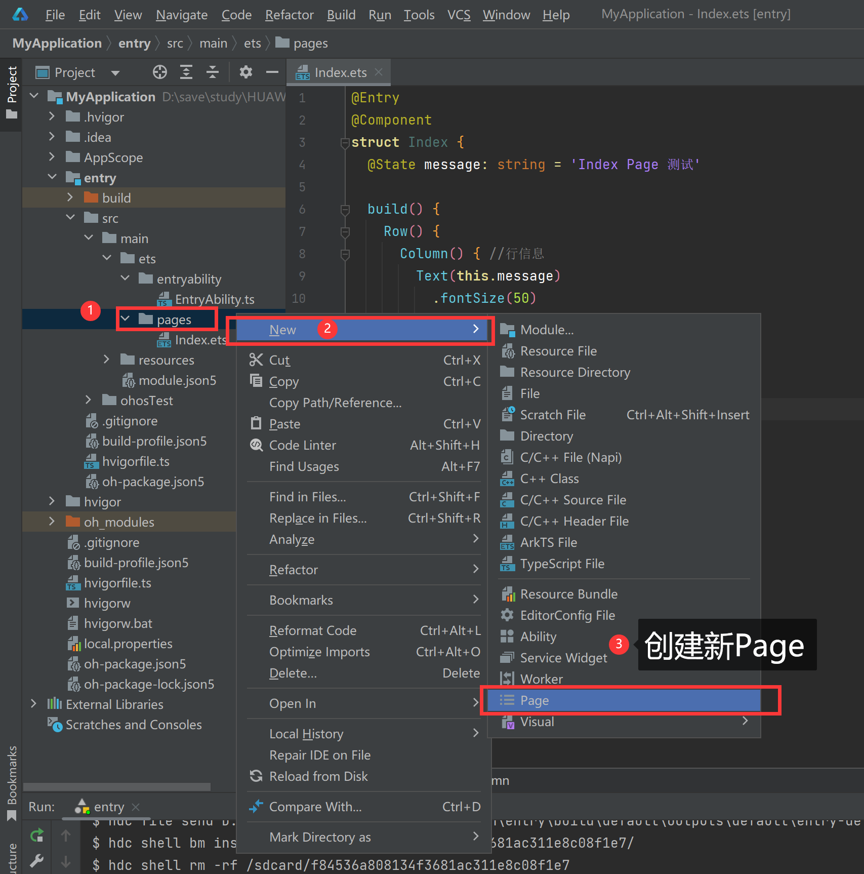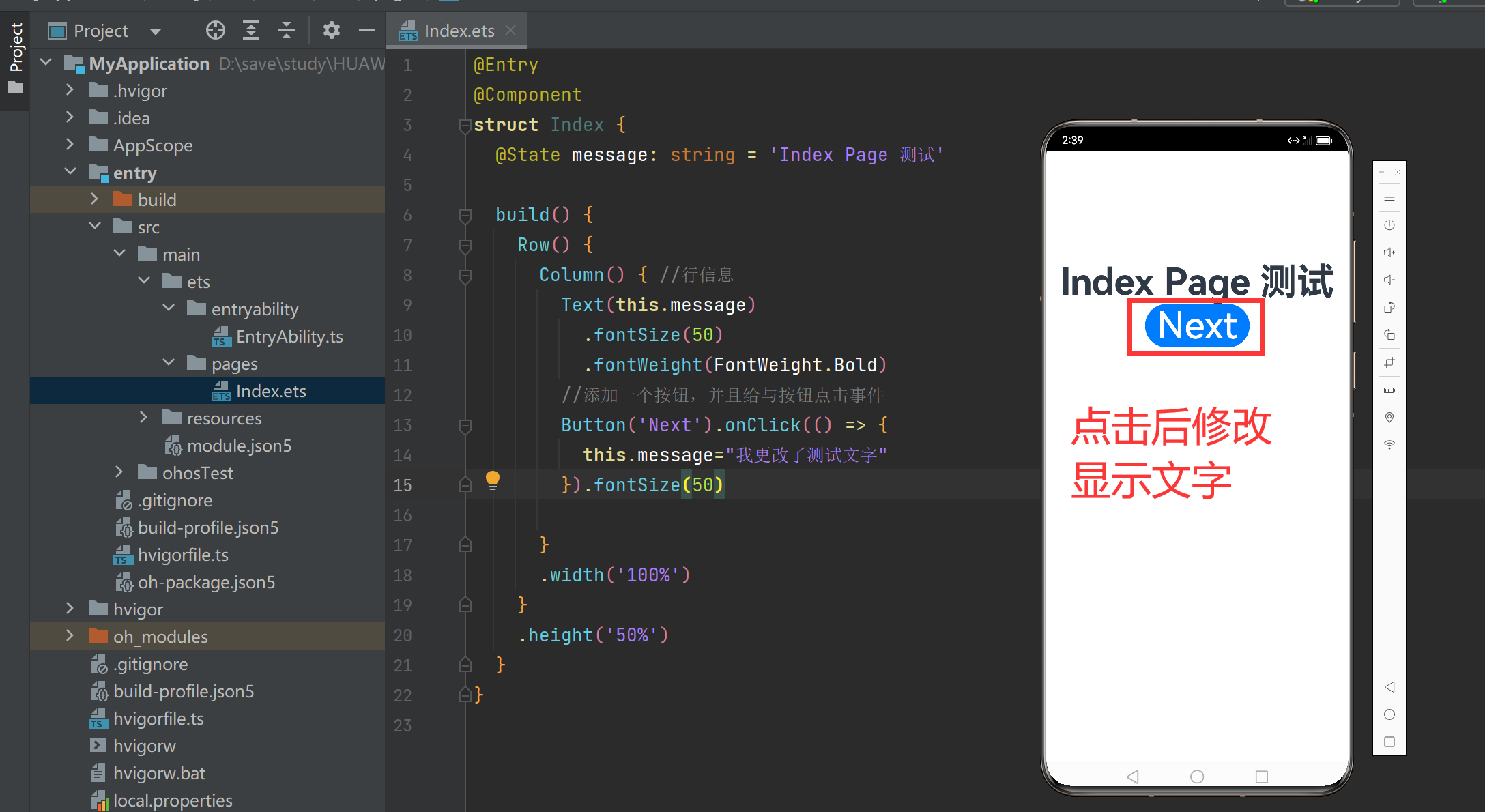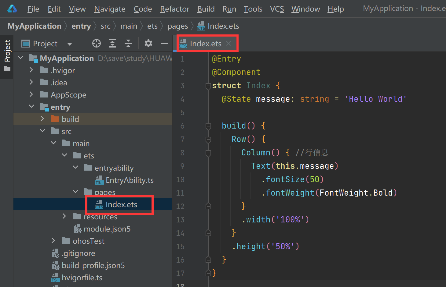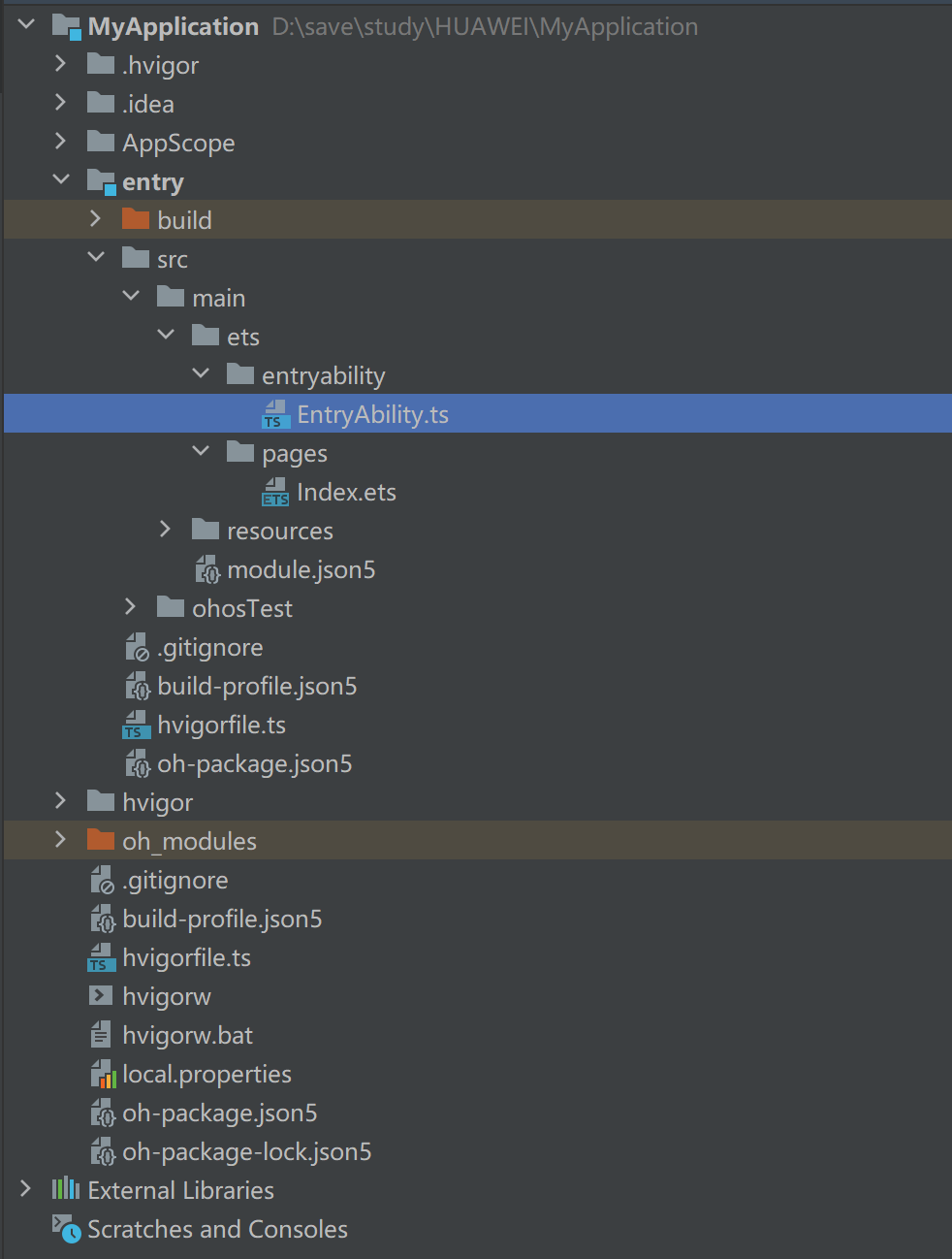 初始的项目中会在【entry/src/main/ets/entryability/】会生成一个EntryAbility.ts文件,在对应的pages下面会有一个index.ets文件。