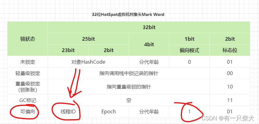 我们可以看到,当对象进入偏向状态的时候,Mark Word的大部分空间都用于存储持有锁的线程ID了,原有的这部分空间是存储的对象哈希码。