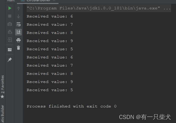 因为我们定义的容量为5,因此往里面push10个值的时候,后面的新值会把前面的值覆盖,所以我们看到输出结果一直都是5、6、7、8、9。且多次读取,循环缓冲区是重复使用的。