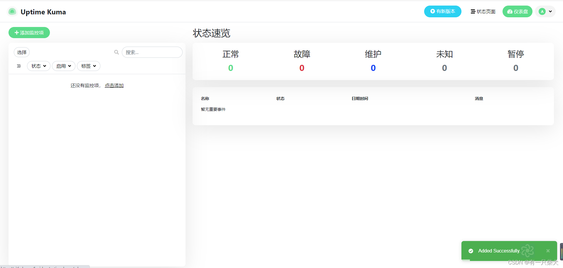 在利用Docker部署项目时,我们需要时刻知道已部署的容器的状态。且通常会把所有的站点监控配置到云平台上,以检测各站点的连通性。而Uptime Kuma就是一个开源的监控工具,还支持告警信息的推送等。我现在所在的项目中,就是用此作为站点健康状态监控的工具。
