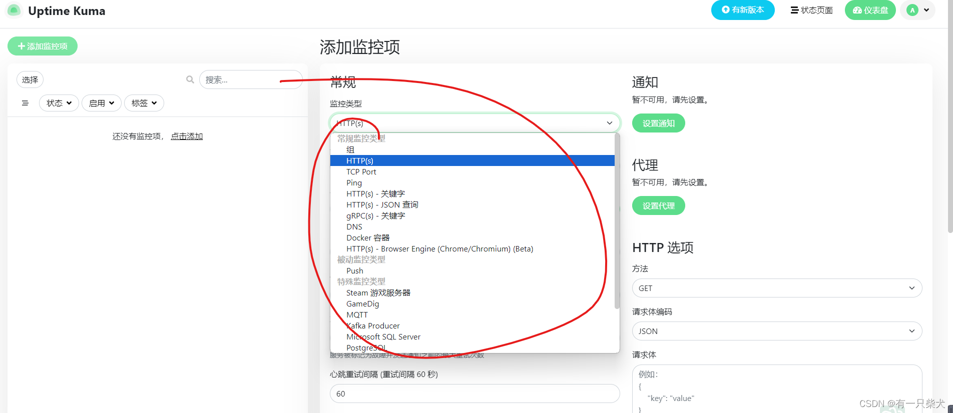 点击添加一个监控项,选择我们合适的监控类型。这里我选择用http方式。