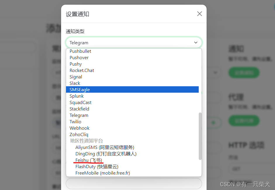 接着点击右侧的设置通知,选择通知的类型,这里我选择飞书机器人通知: