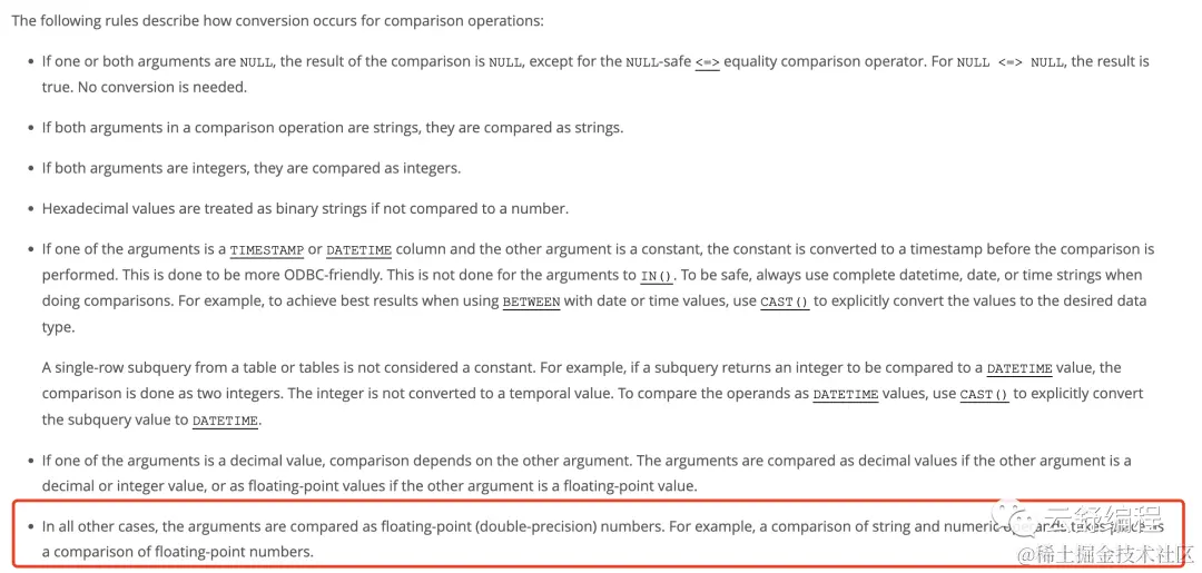 最后一段的意思是:对于其他情况,将按照浮点(双精度)数进行比较。例如,字符串和数字的比较就按照浮点数规则进行比较。 也就是id会首先被转换成浮点数,然后再跟0进行比较。