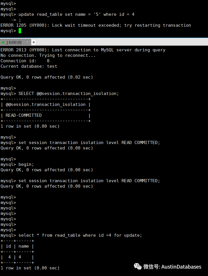 或者你使用了自动检测死锁,同时将innodb_lock_wait_timeout = 更大的数值,那么你得到的结果就与隔离级别有关了,如果是RR 的情况,你将会获得 update 0 的结果,如果是RC 数据还在的情况下,你会获得update 对应结果的结果,如果相关的行不在的情况下,获得结果也是UPDATE 0 的结果。