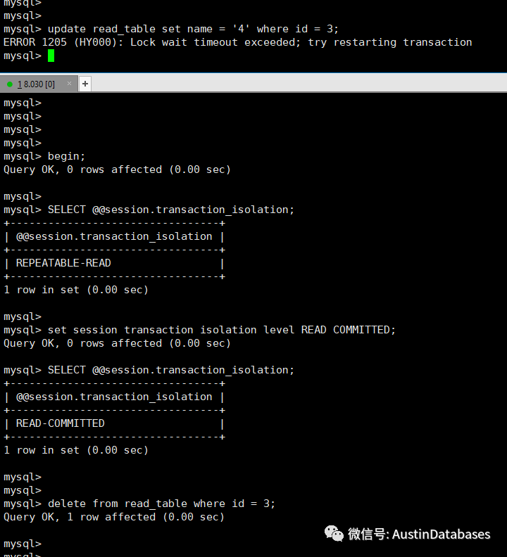 在MYSQL 配置中如果使用的 innodb_lock_wait_timeout =3 的配置的情况下,在很短的时间数据库就能判断出BLOCKED 或死锁,在这样的情况下,无论使用什么隔离级别,那么结果都是一样的,都会是锁超时的报错和让你重试的信息。