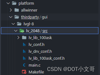 }接下来则是对接 lv_lib_100ask 与 2048 小游戏,我们先下载 lv_lib_100ask 的源码,放置到 platform/thirdparty/gui/lvgl-8/lv_2048 的 src 文件夹里。并按照 lv_lib_100ask 的说明,复制一份 lv_lib_100ask_conf_template.h 到 src 目录,并改名为 lv_lib_100ask_conf.h