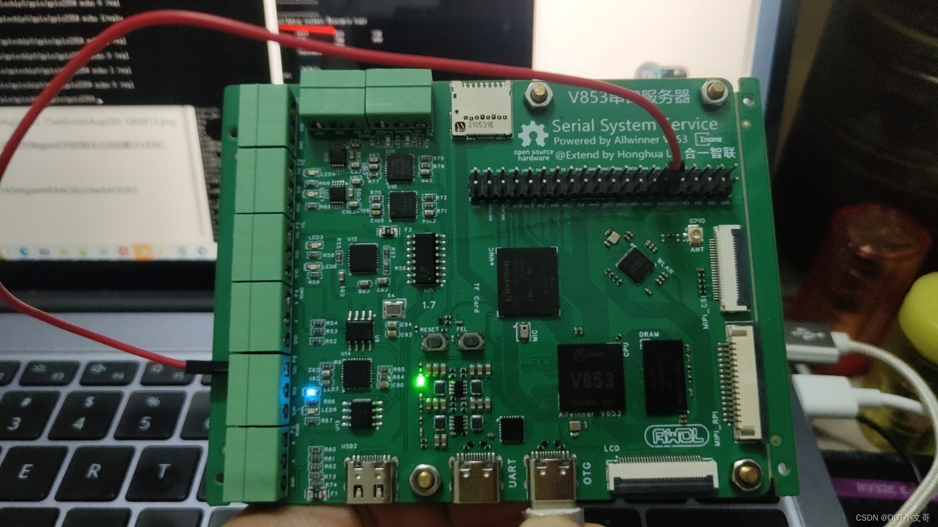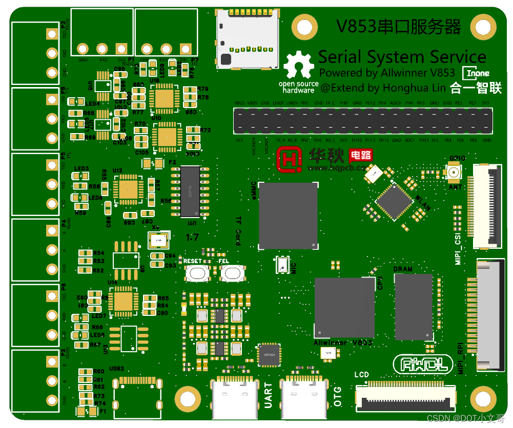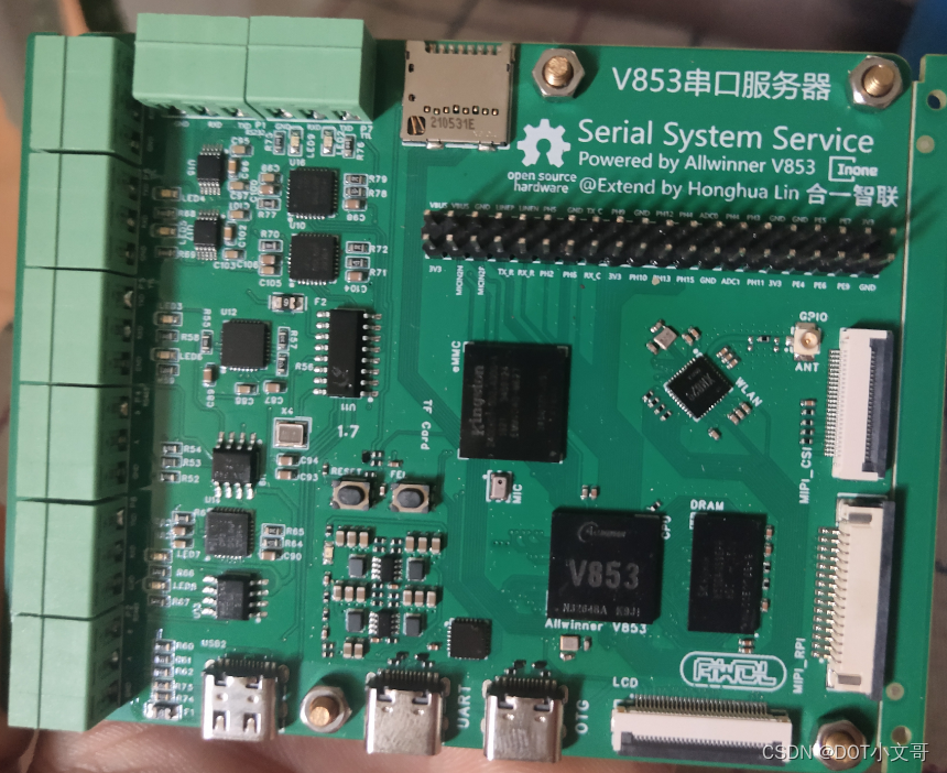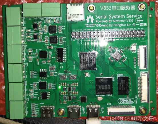 1、V853最小系统,运行linux操作系统,尽可能运行桌面系统,这样可以像操作电脑一样编辑串口数据。 2、WIFI模组实现联网功能。 3、显示屏LCD接口,用来显示操作界面。所以有了它就更像一台小电脑服务器。 4、摄像头接口,这是预留接口,用来实现摄像头监控,在数控机房里面特别适合。 5、”USB-HUB扩展4路USB接口,通过USB转串口芯片CP2102实现2路R232,2路RS485,4路TTL,总共实现8路串口功能。满足了我们多功能串口服务器。