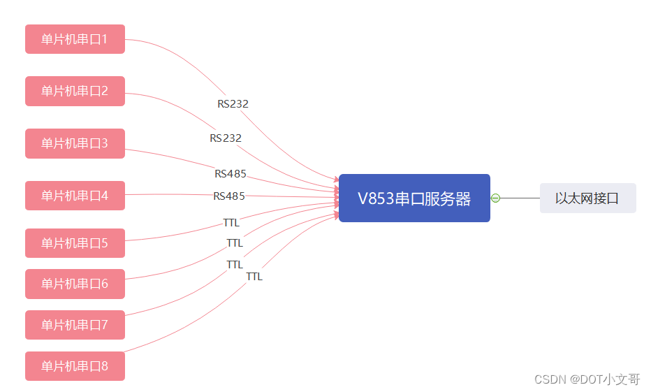 串口服务器网上也有相关的产品售卖,虽然不知他们的控制原理,但是对我来说只需要将串口数据发送到V853上,通过它进行数据解析后集中通过以太网接口发送出去就实现了串口服务器和路由功能。