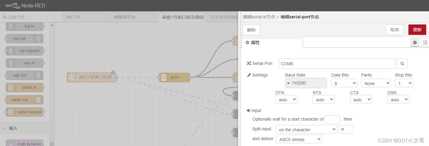 例如串口功能,MQTT功能,TCP功能等必要的组件都可以安装实现,只需要设置需要参数就可以完成相关功能,同时还可以进行数据解析,并通过Dashboard数据可视化界面做上位机显示到显示屏上面,摄像头的调用可以使用里面的组件去调用,可以说node-red可以轻松实现串口数据转以太网,实现任何一个串口设备都可以轻松连接到服务器。如下图就是各个节点功能的使用案例。