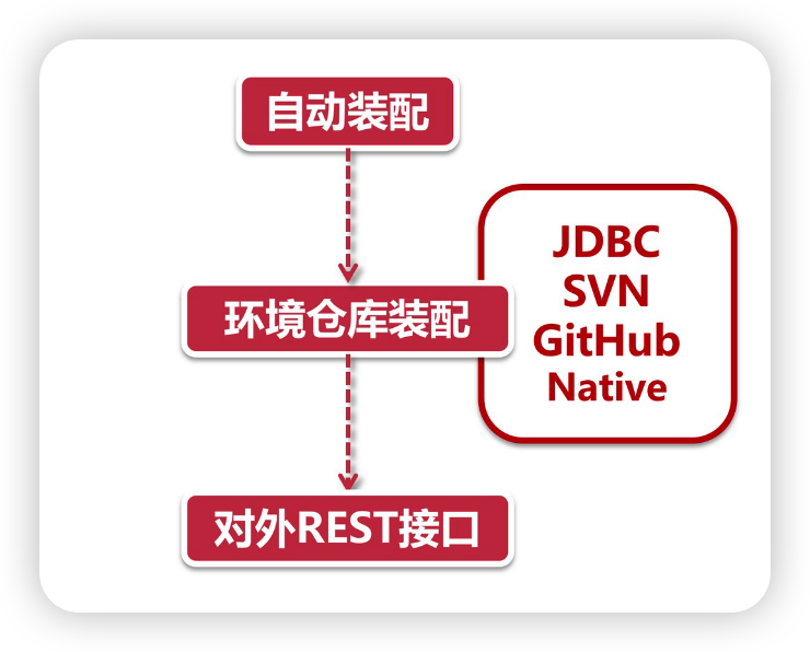 Spring Cloud 的一贯传统,一段故事从一个注解开始。我们只要在启动类上放个@EnableConfigServer 注解就可以了,Config 内部再通过@Import 注解引入其他配置类,完成自动装配(具体承担自动装配的类是ConfigServerAutoConfiguration)EnvironmentRepositoryConfiguration 这个类。Config Server 支持很多种文件存储仓库,比如 JDBC,SVN,GitHub 和本地文件,当然也可以配置多种类型组合的方式,也就是说 Config 会从不同的地方拉取配置文件。默认情况下 Config 采用基于 GitHub 的集成方式,这也是官方建议的方式REST 接口:从外部环境拉取到了配置文件之后,需要返回给客户端。Config 通过 EnvironmentController 这个类对外提供了一套供客户端调用的REST 格式接口,所有服务都是通过 GET 方法对外提供,客户端可以通过不同的 URL 路径获取相对应的配置内容除此之外,Config 还提供了属性转换的功能。假如我们提供的配置文件是 yml 形式的,如果希望获取其他格式的配置项,那么在调用第三步中的 REST 接口时可以在 URL 后面以扩“展名结尾,比如 .json” ”或者 .properties“,Config Server 会自动将配置内容转为对应格式。
