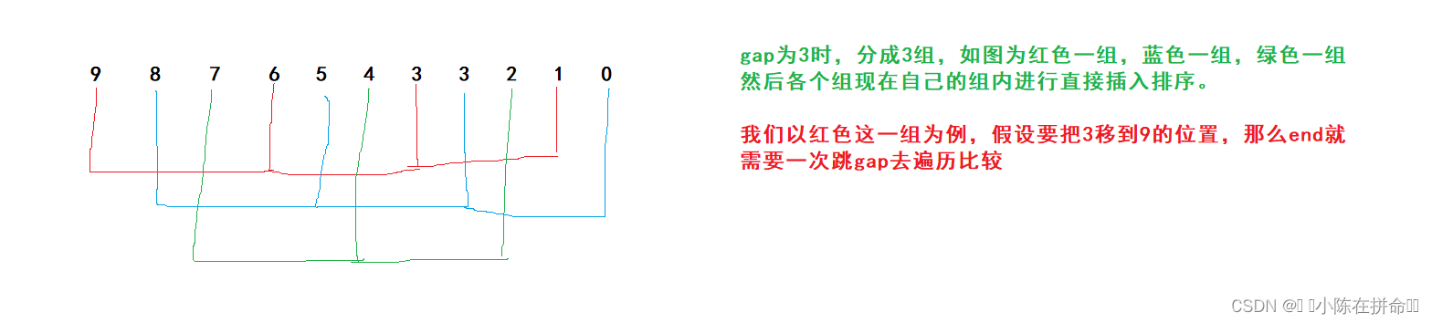 }我们发现,如果我们一开始让i=1,就可以实现蓝色组的排序,让i=2的话,就可以实现绿色组的排序,所以为了让三组都完成排序,我们再外面再嵌套一层循环!