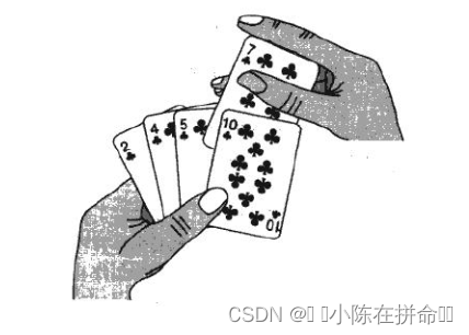 这个其实也跟摸扑克牌有关,但是这次跟直接插入排序不一样的是,直接插入排序是一次摸一张牌然后插入调整,而选择排序是一次性拿了所有牌,再逐个把小的数往前放!