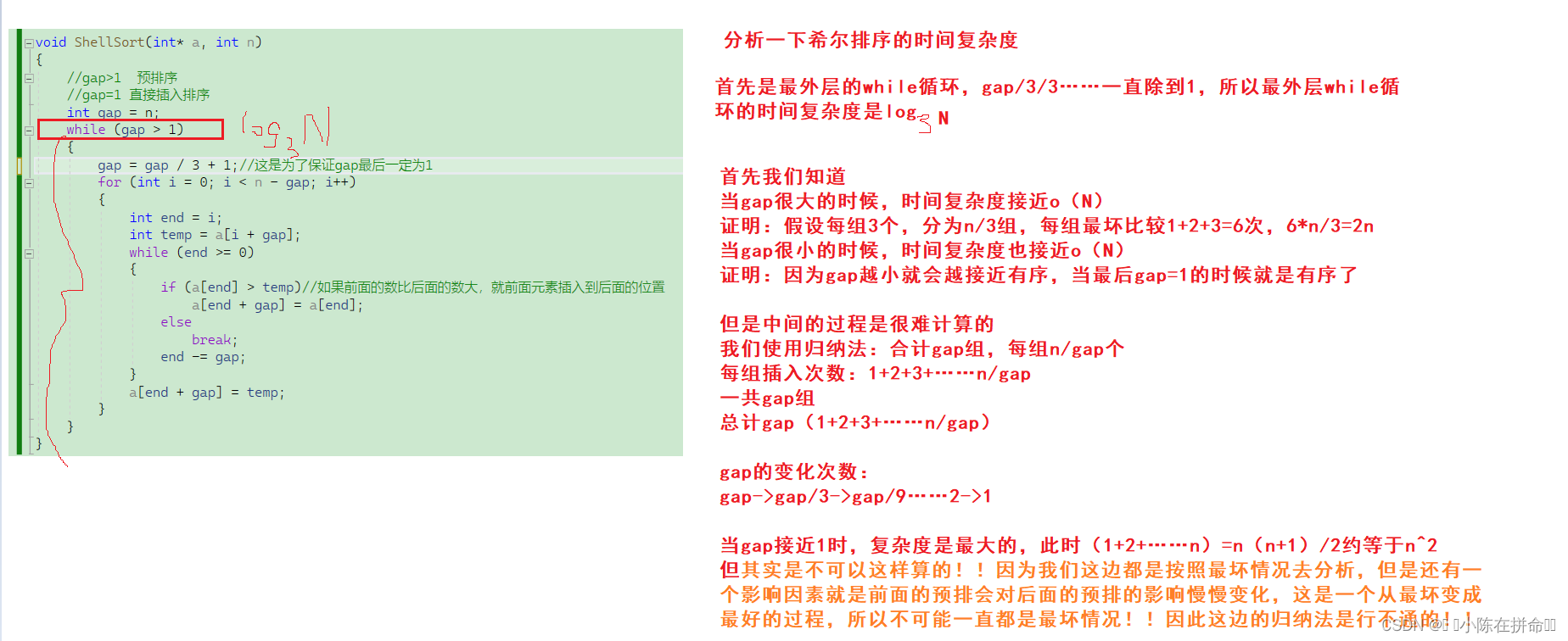 }需要注意的是:gap = gap / 3 + 1是为了保证gap最后一定会等于1,也就是一定会在最后进行一次直接插入排序,保证有序,而前面gap>1的过程都是在进行预排序!!